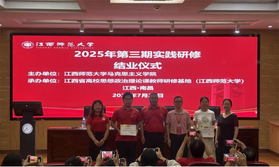 最后,研修班全体教师来到江西师范大学马克思主义学院参观交流学习,许浩书记、王威副院长分别进行总结发言,认为此次研修组织严密,保障有力,全体教师学用结合,收获满满,期望院校之间加强共商共建共享,深化在思政课建设方面的交流合作;并号召各位教师要将此次研修所学、所思、所感融入思政教学中,创新教学方法,丰富教学内容。最后,学院为所有研修教师颁发了结业证书。